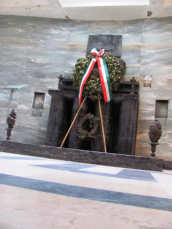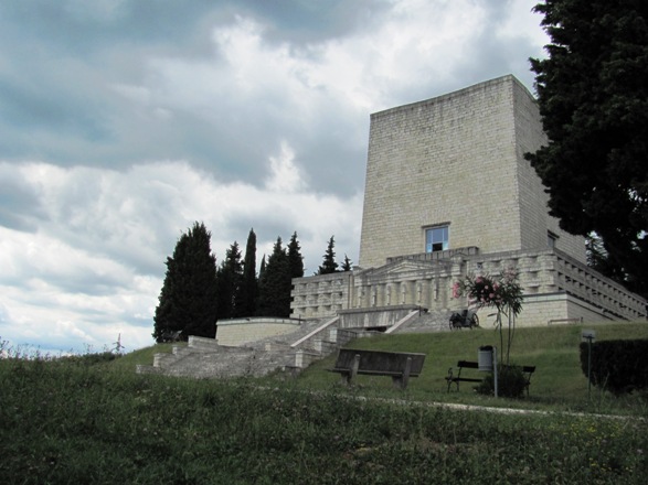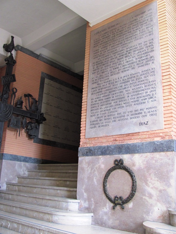 A fenti fotó történetesen a Nervesa della Battaglia-i emlékmű, „Il Sacrario del Montello" egyik figyelmeztető tábláját örökíti meg. Utóbbi a Piave-folyónál zajlott harcokban elesett katonák számára, Mussolini rendszere által a harmincas években (a frontmozgásról részletesen az előző posztban) állított gigantikus memeno.
