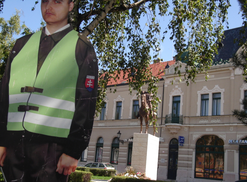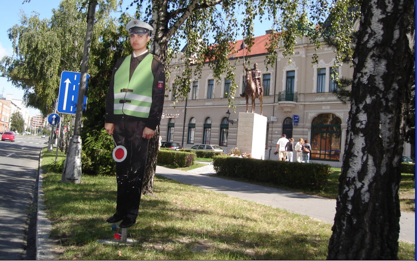 Fogalmunk sincs, hogy a szobor szempontjából véletlen, vagy szándékos, de egy szlovák papír-rendőr van az út szélén.